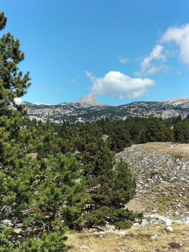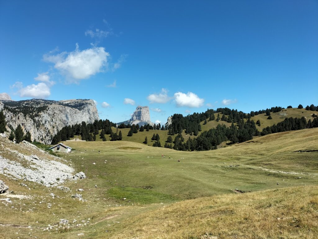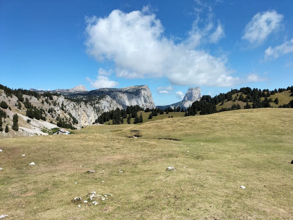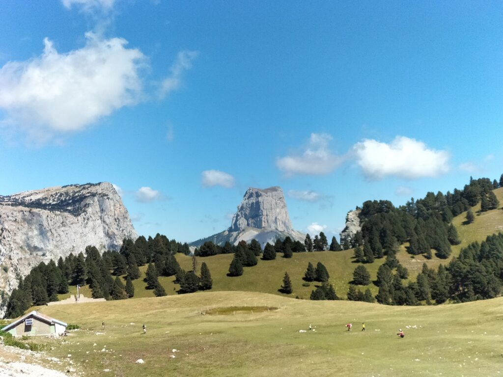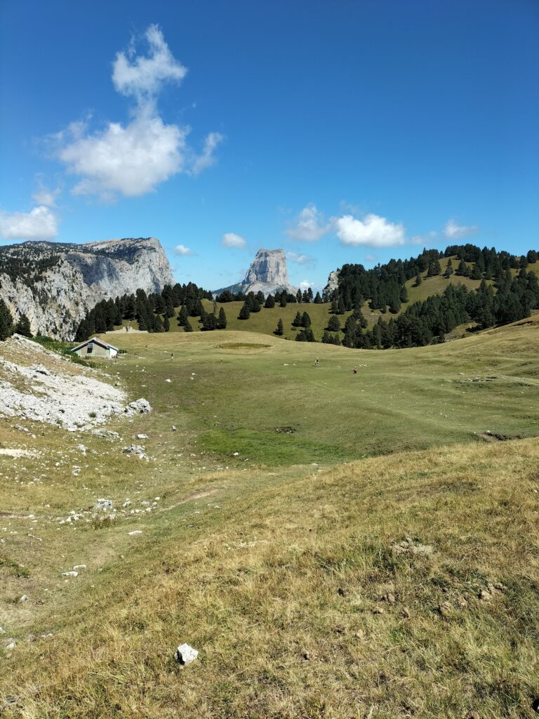 La randonnée du Pas de l’Aiguille traverse les hauts plateaux du Vercors avant de rejoindre le célèbre passage qui domine le mont Aiguille. L’itinéraire alterne prairies d’altitude, zones calcaires et larges panoramas, avec une vue spectaculaire sur cette montagne emblématique dès l’approche du pas.