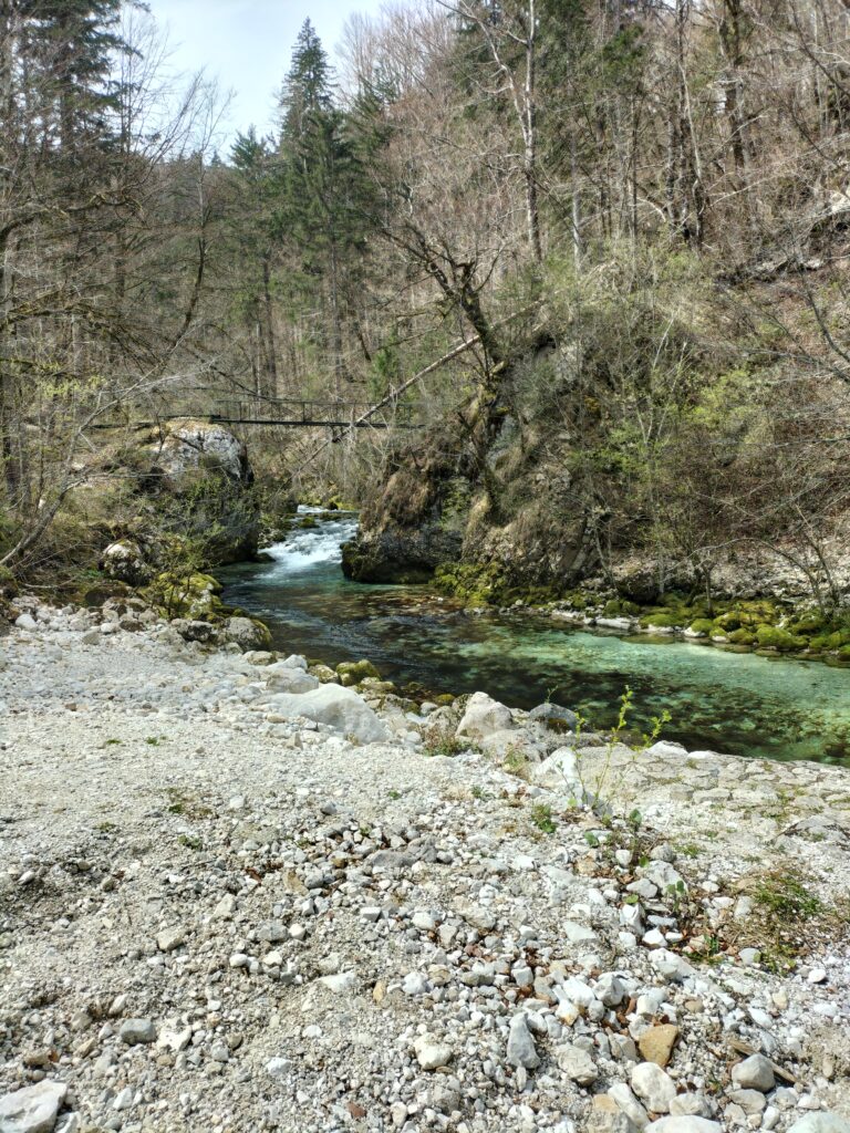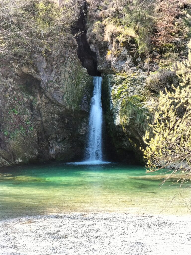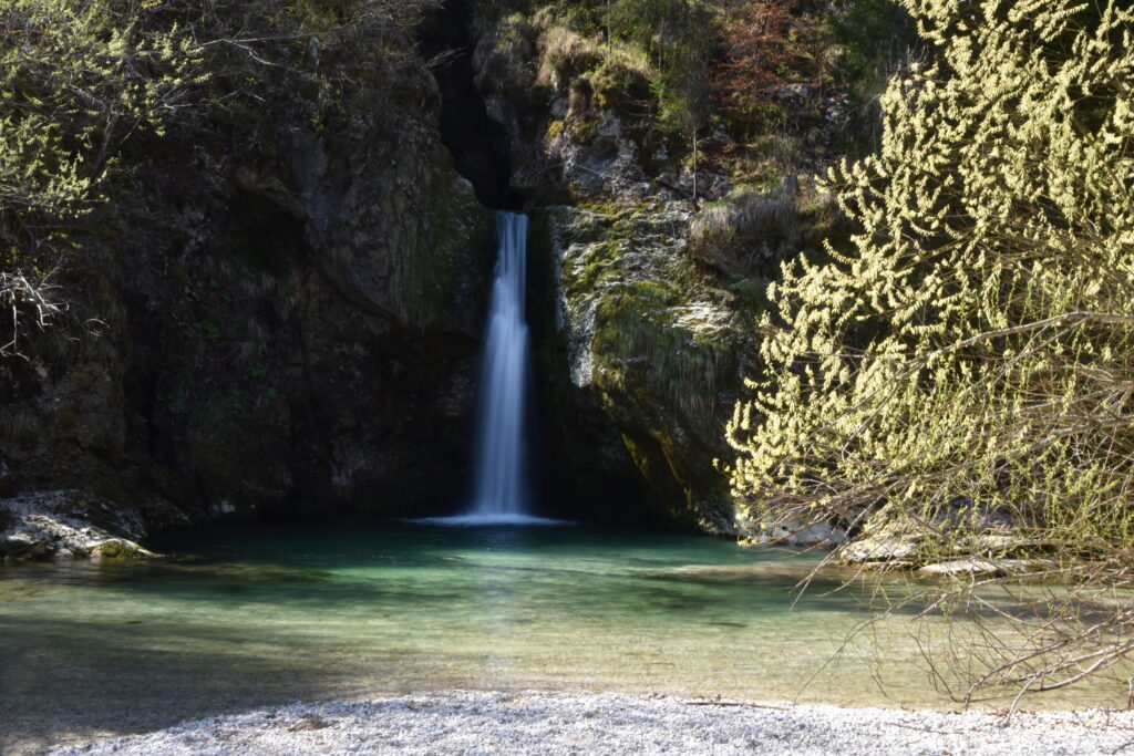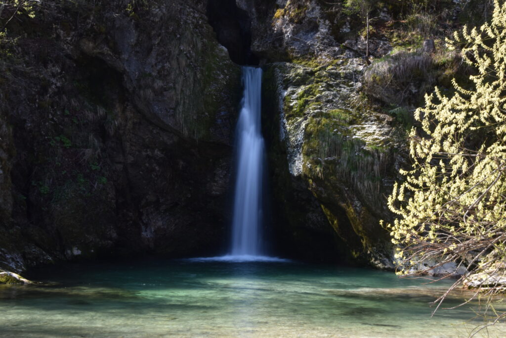 Une courte marche le long de la piste cyclable mène à Slap Grmečica, une petite cascade facile d’accès où l’eau s’écoule dans un bassin clair au pied de la paroi rocheuse.