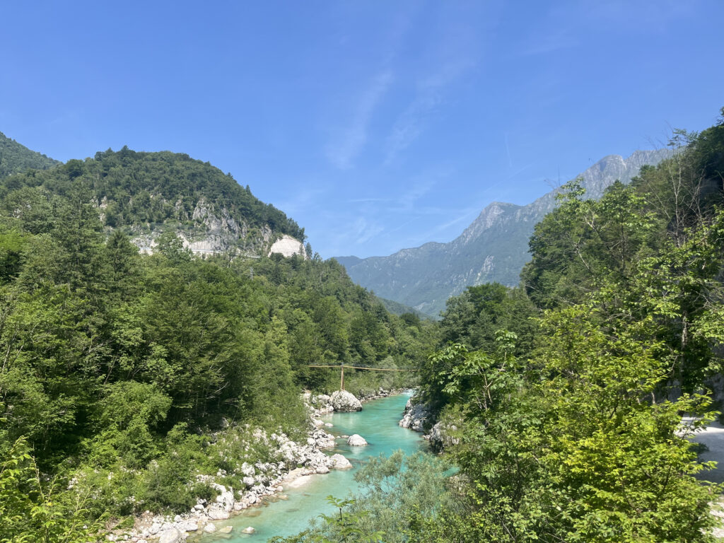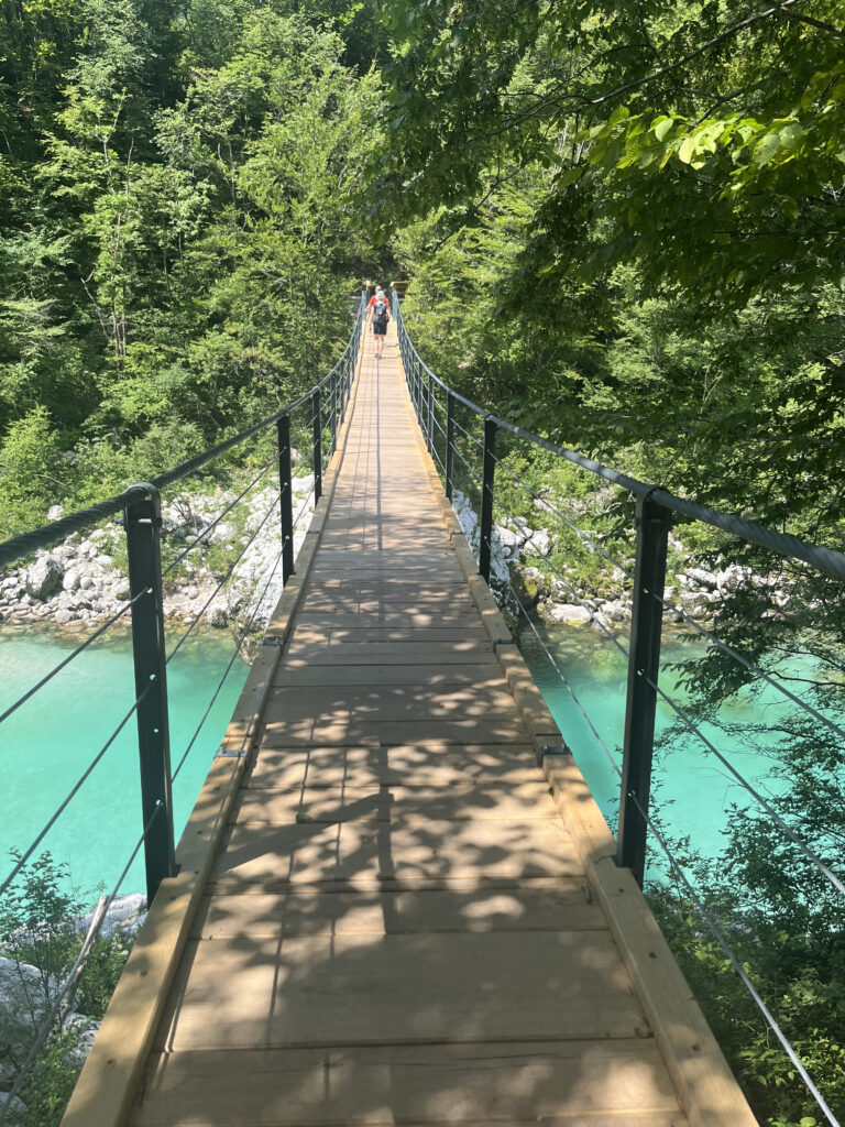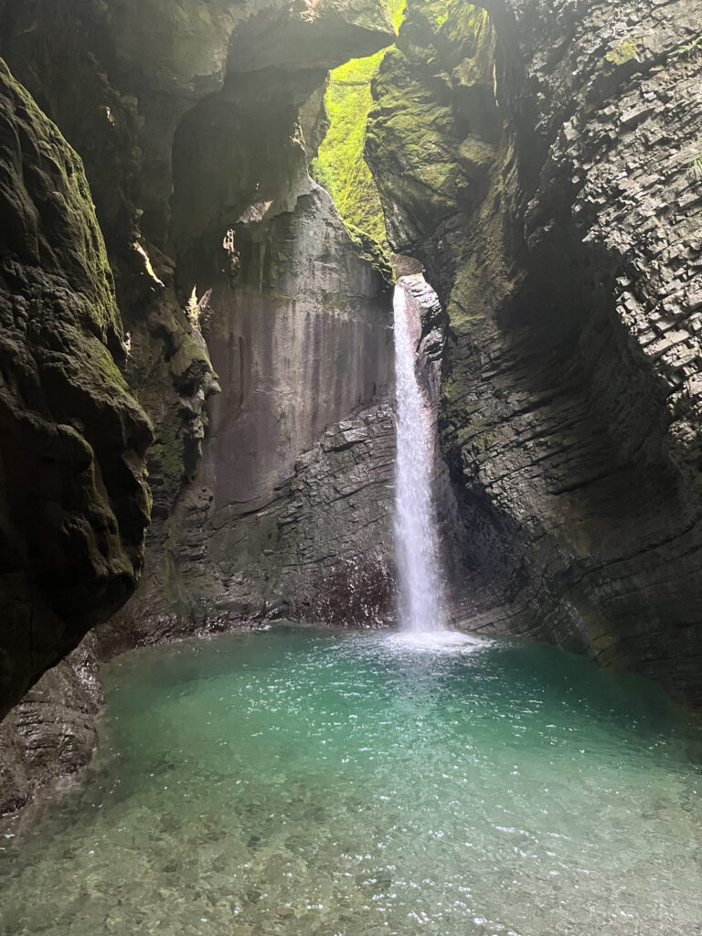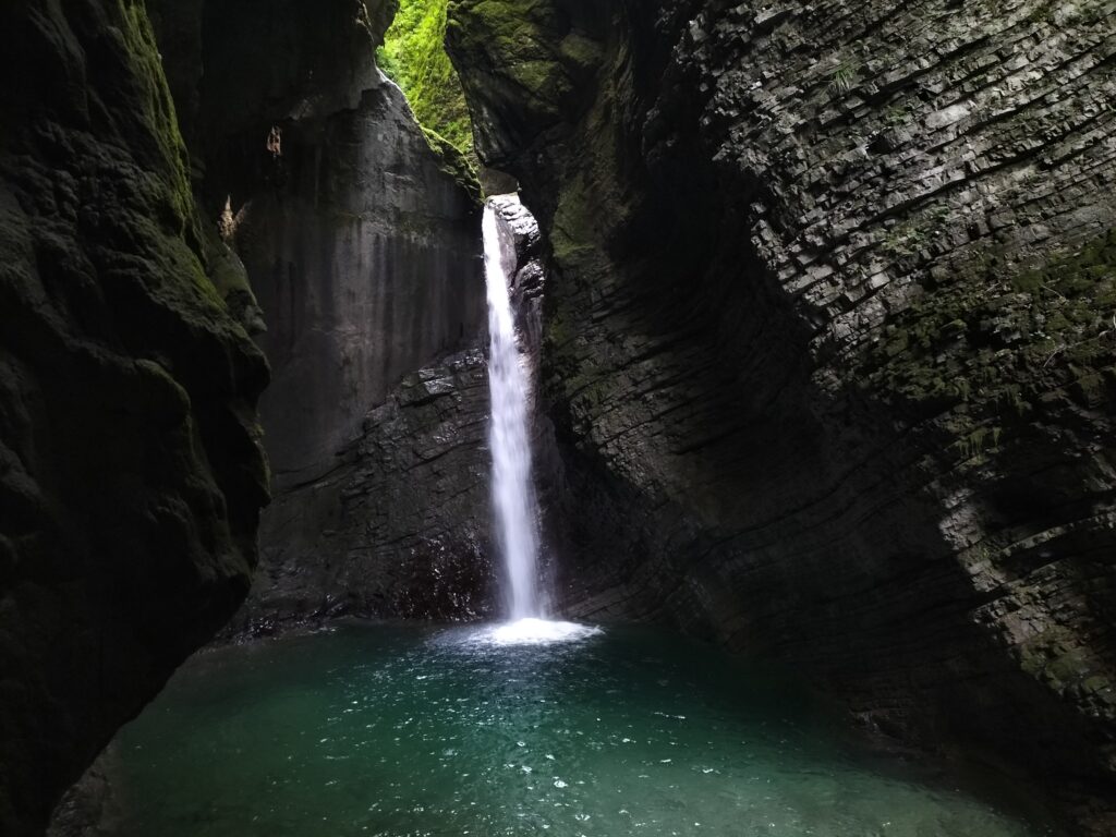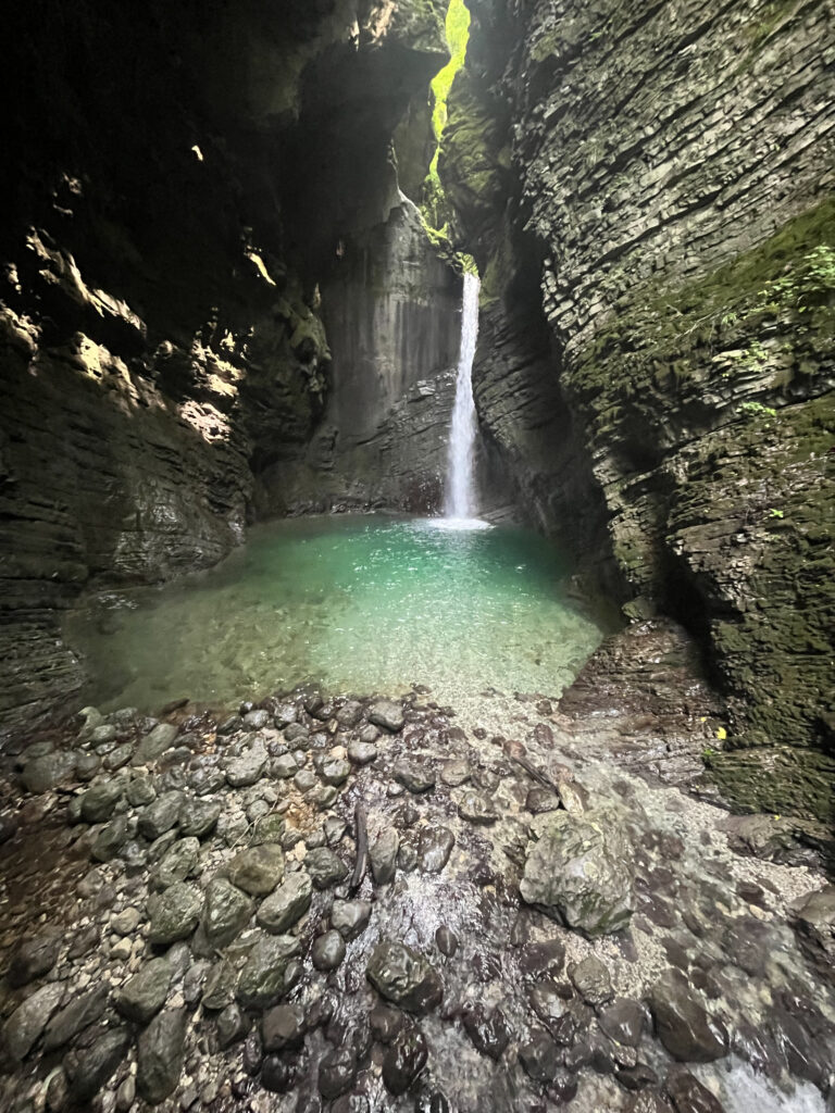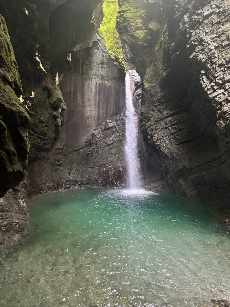 Slap Kozjak est l’une des cascades les plus emblématiques du secteur de Kobarid. Le sentier est facile et bien balisé, avec plusieurs passerelles et sections aménagées le long de la rivière. Le départ peut se faire depuis le camp Koren, ce qui évite de prendre la voiture.