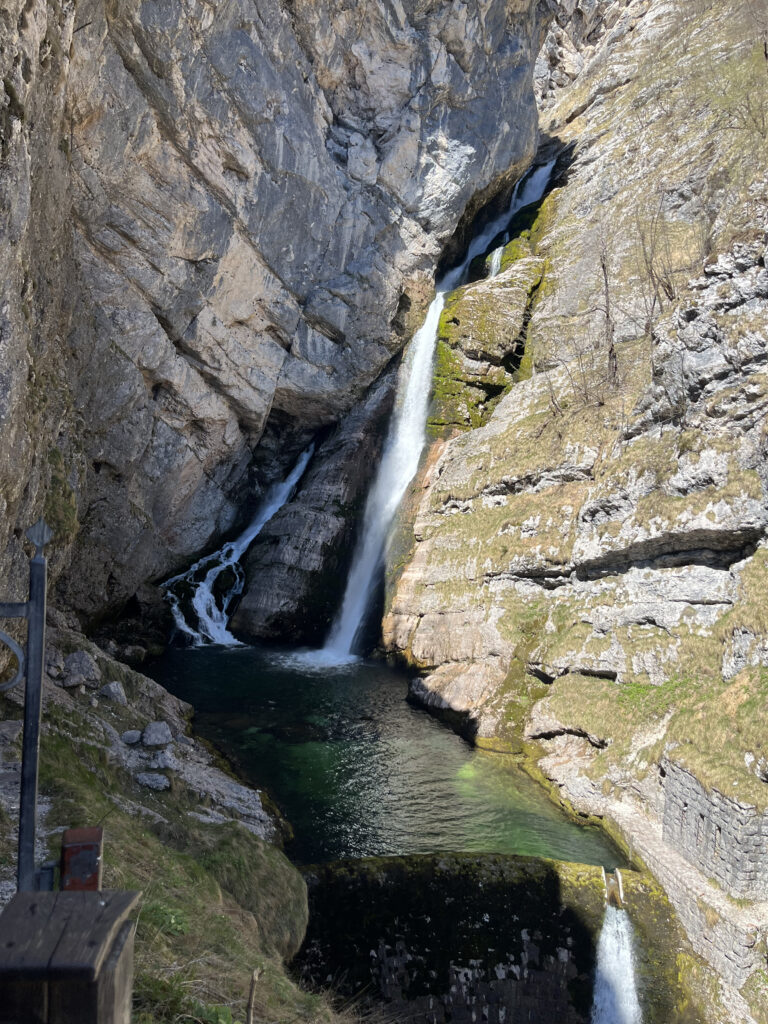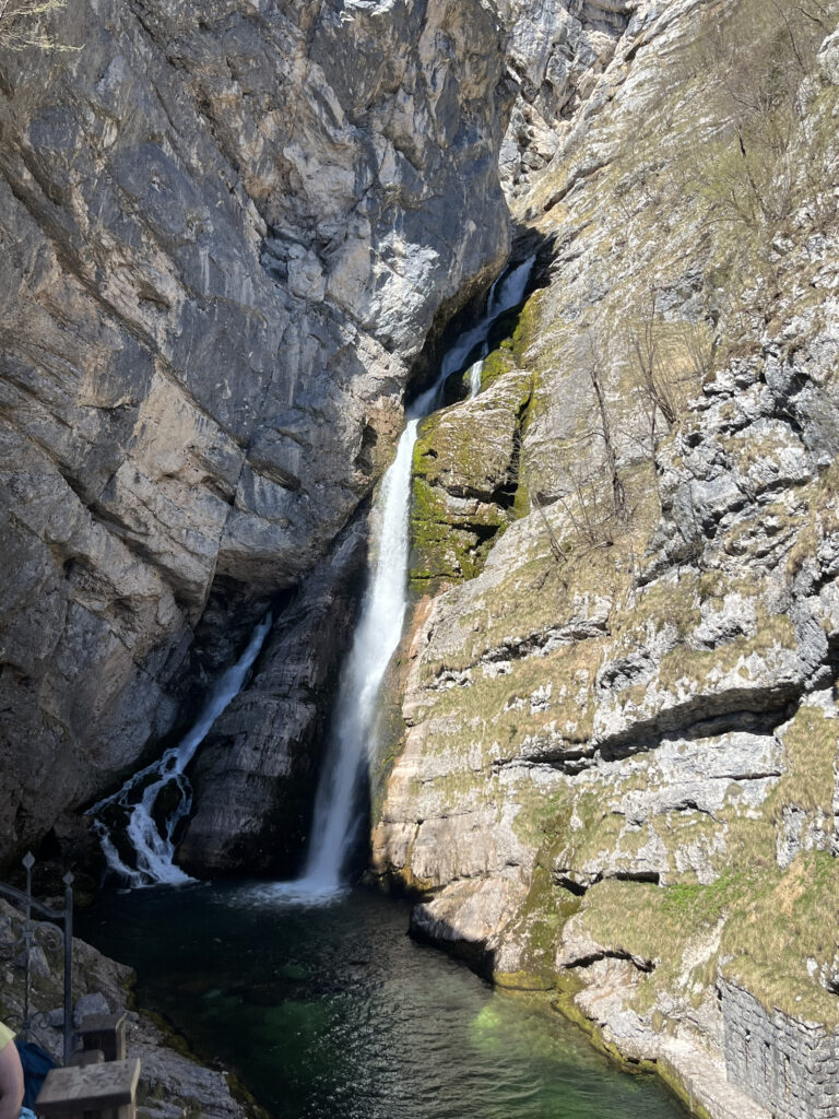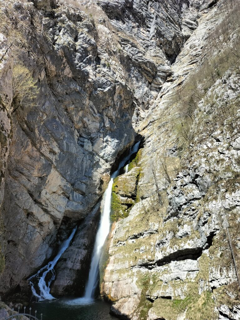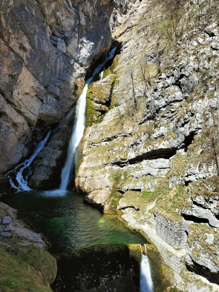 Slap Savica est l’une des cascades les plus connues de Slovénie, située au-dessus du lac de Bohinj. L’accès se fait par un sentier aménagé et un long escalier qui mène à un belvédère face à la chute. La cascade jaillit directement d’une paroi rocheuse en formant un « A » caractéristique, ce qui en fait un site très reconnaissable.